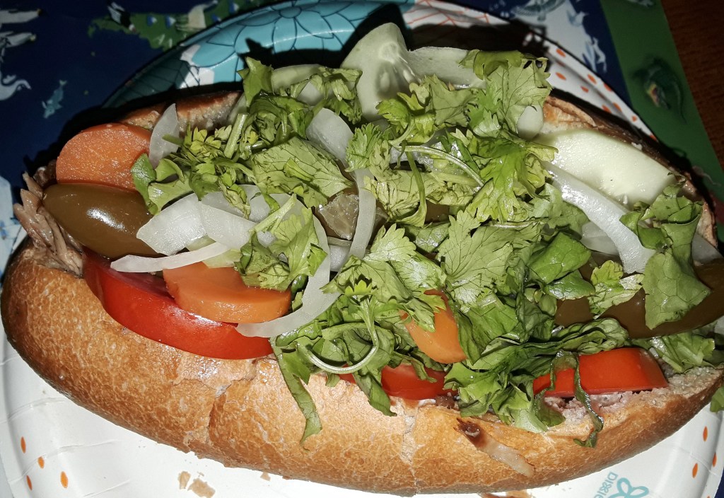 You can now enjoy the pork to your liking. We made sandwiches (below) at home with some toppings, garnishes and a little of the reserved liquid.