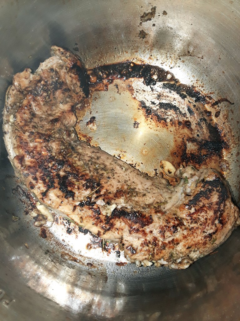 4. On the second tenderloin, I added a little more oil and braised it for about 2-4 minutes per side, or until each side is seared. I proceeded to air bake at 400 degrees for 10 minutes and then turned over and cooked this one for 8 minutes because it did reach the 145 degrees a little faster than the pervious one. Cover the meat with foil and let it rest for at least 15 minutes. I deglazed the bottom of the pan with 1 cup of broth and a 1 Tbs. of cornstarch to create a sauce. I seasoned with salt and pepper to taste.