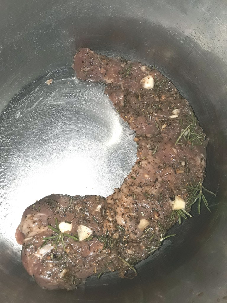 1. Clean the tenderloin and pat dry. Make some incisions in some areas of the loin. I did them mostly on top. You’ll see why in a moment. Coarsely chop garlic, separating about 1/2 of them for later. Also, set aside some springs of rosemary for later, as well. Add all the dry a ingredients and crush using a pestle and mortar or knife. Add oil and Worcestershire sauce, vinegar and grind into a rough paste. You can check for salt and pepper at this time before adding it to the meat.