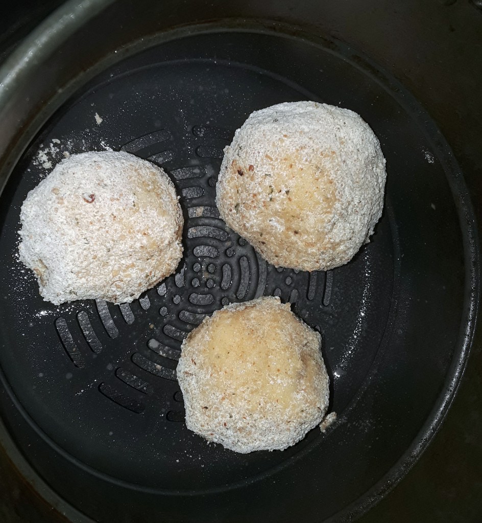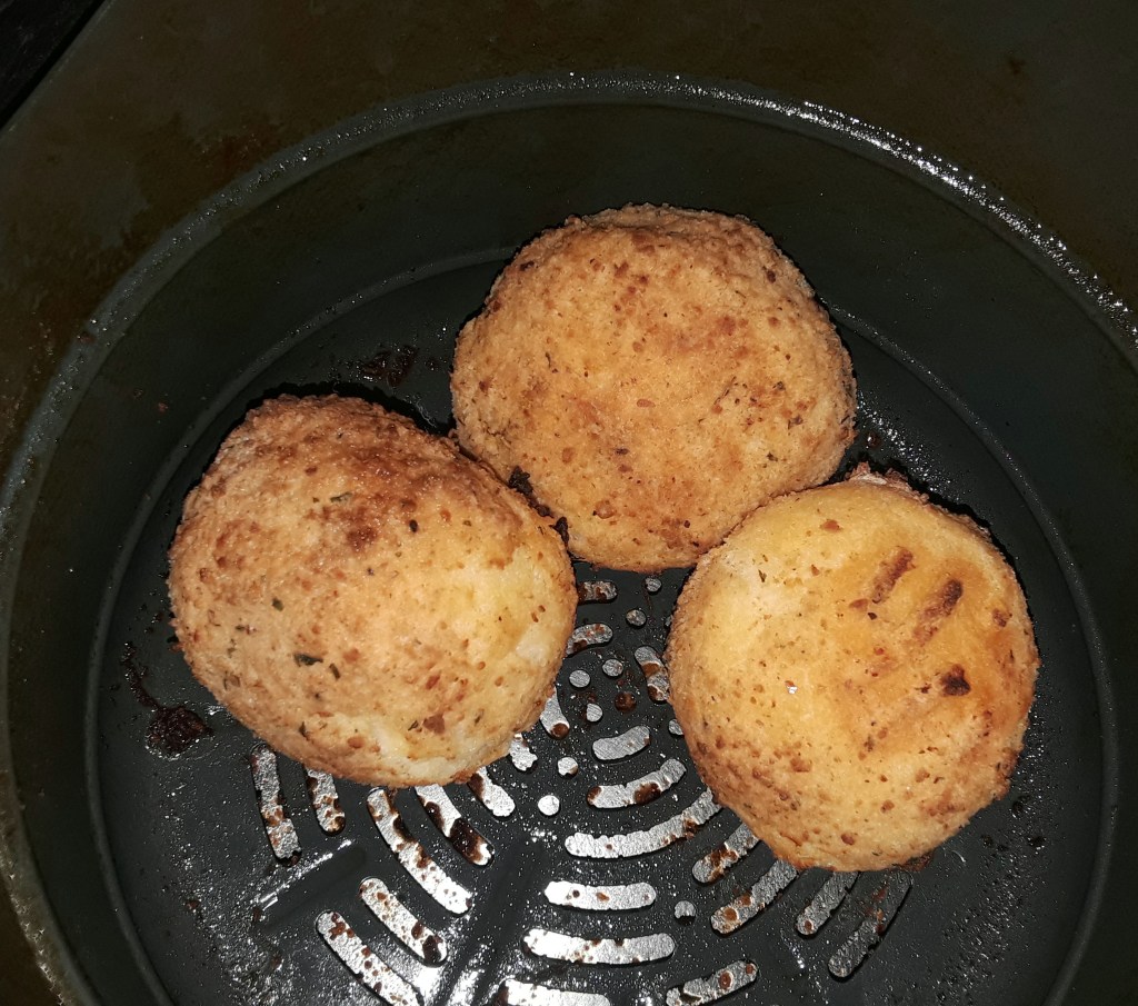 8. Spray oil on the bottom of your fryer, or use parchment paper, and place 2-4 balls with some room to spare in between so as not to crowd the pan and let the air flow throughout. I use my air fryer attachment for my instant pot, so I only placed three (3) balls at a time. Spray some more oil on top of the ball. close and set your fryer to 400 degrees and cook for 12-14 minute, turning it over gently halfway and spray more oil.