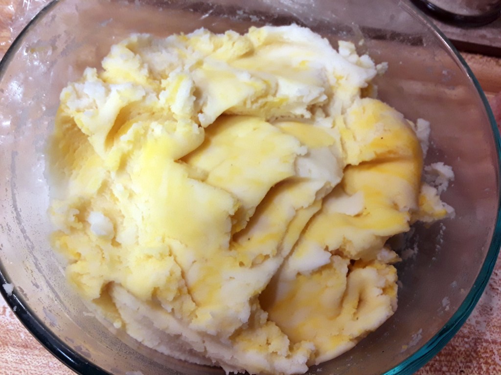 2. Prepare instant potatoes as directed except reduce the liquid by 1/4 to 1/2 cup according to directions. I used two packs of instant potatoes and each require 2 cups. I ended up using 1/2 cup less of liquid to make the potatoes a little more stiff and easier to handle. You can use your preferred brand or cook about a 1 lb of russet potatoes and mash up and prepare so that it isn’t too mushy.