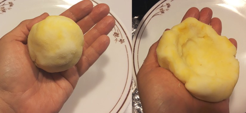 5. Take out potatoes and wet hands a bit. grab a spoon and add the mashed potatoes to forma a ball the size of your palm. Wet you hands a bit so that it won’t be sticky. You can make them any size you like, but smaller ones are easier to control. Make an indentation with your thumb to make a “pocket” to place the meat in.