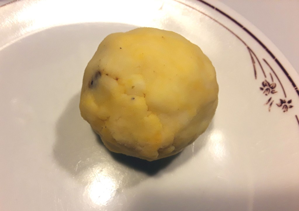6. Using about a tsp, add the meat into the indent, making sure not to over stuff. Close over the meat gently using the outer potato. If you need to, add a little more potatoes to cover up an open area. Roll around in hand, using a little water if you need to keep the ball from sticking to your hands. It should like like the photo below this one.