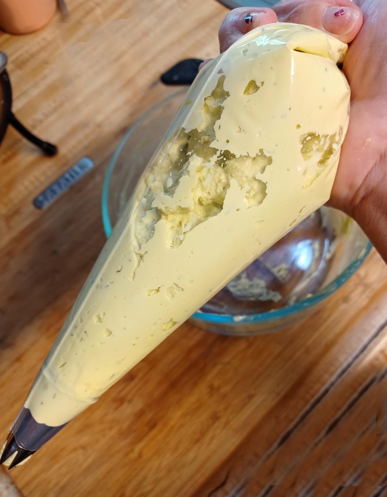 3. Set up the piping bag using the piping tip, fold over the top of the bag and using a silicone spatula fill bag with the egg mixture. fill each egg halves as evenly as possible.