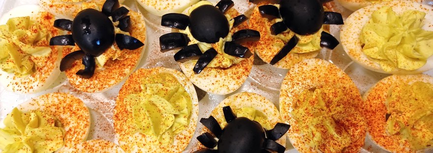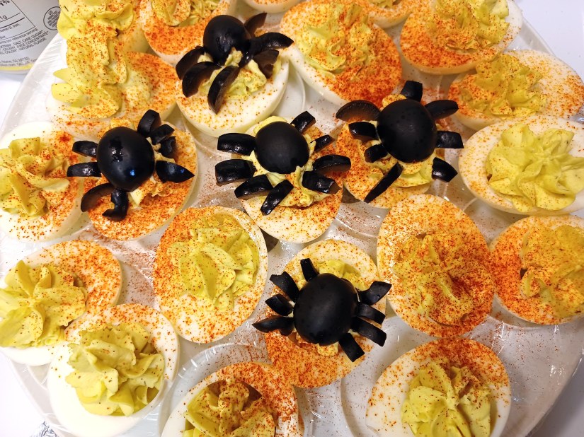 You can now garnish the eggs with a little paprika and I used the black olives to make little spiders for the Halloween season. I cut them in half and used the other half to create the little eggs. I think they came out cute. I didn’t do all of them because I know some people may not like the olives. I hope you give this a try if you like deviled eggs the next time you need to bring an appetizer to a party. Thank you again for stopping by and Buen Provecho!