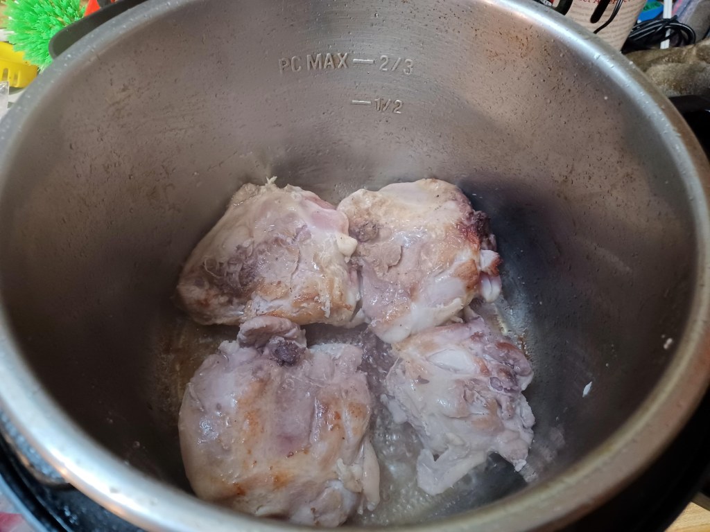1. Turn on pot using the sauté feature. Add the lard or oil. Lard is more traditional and really adds tons of flavor. When oil starts to shimmer, brown the chicken thighs (with skin on) for 2-4 minutes per side. Once done, remove and set aside.