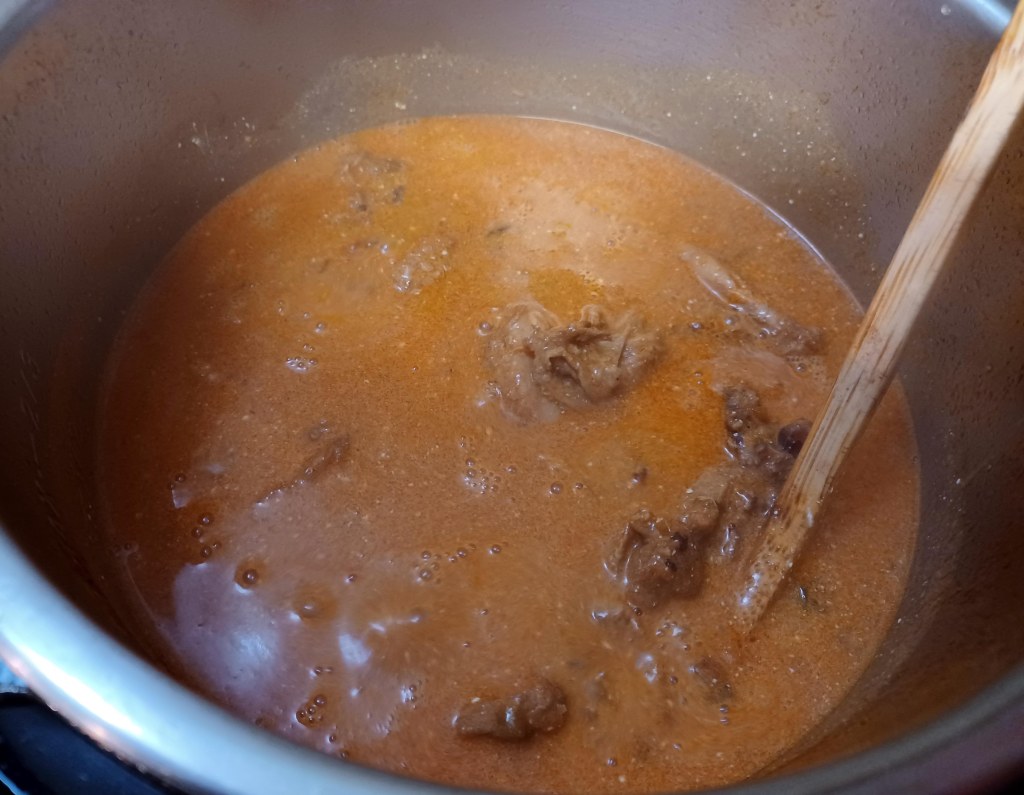 8. Turn on the sauté feature and bring to a boil. Now add the sour cream and flour slurry. Stir and remove the bay leaf. Turn off and add the juice of half a lemon and mix.