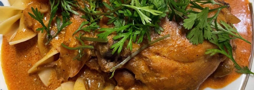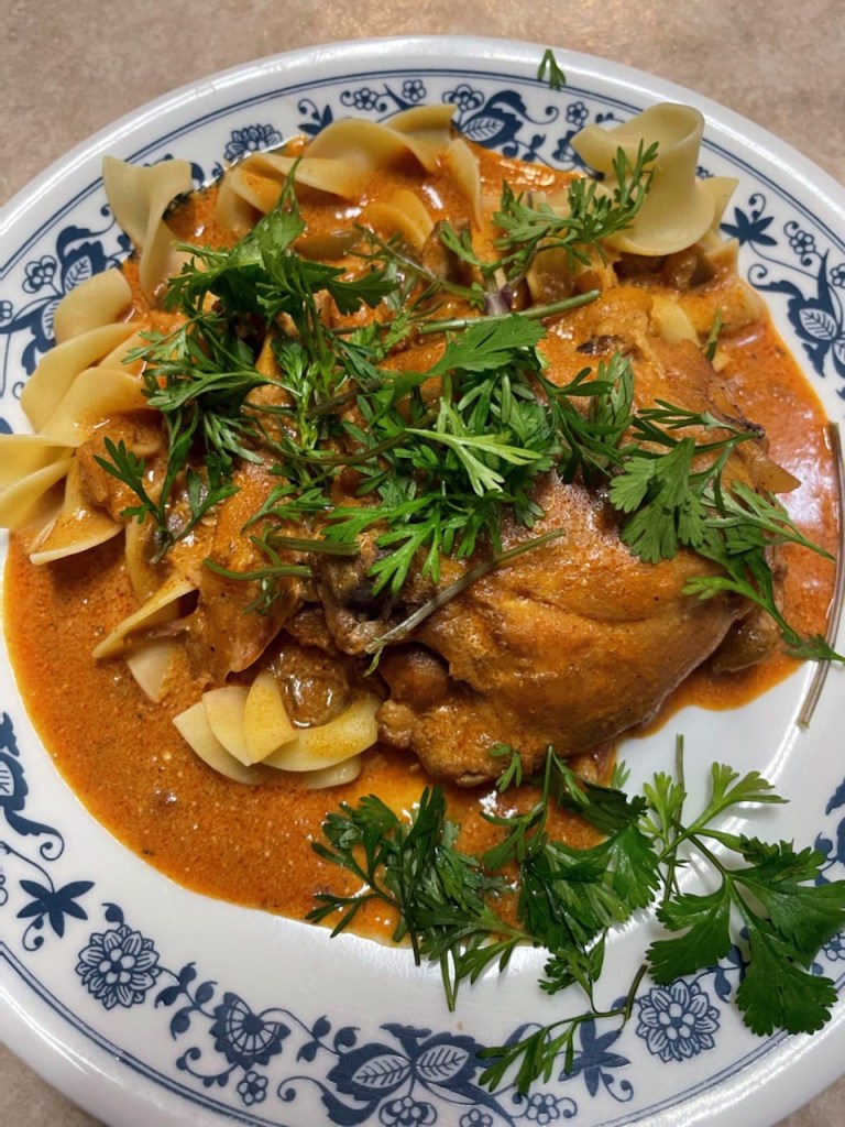 Your chicken is ready to eat. I served it with egg noodles, not the traditional Hungarian nokedli, which is a whole another dish. But thankfully, this paprikash works well with many other side dishes like, rice, noodles, by itself or whatever you have on hand. Garnish with parsley or cilantro for extra freshness and goodness. I hope you give this dish a try. Buen Provecho!