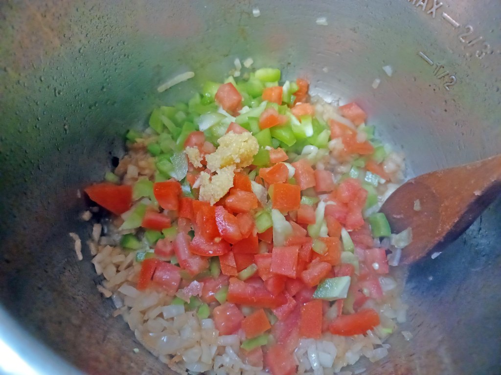 3. Next, add tomatoes and garlic. Cook for an additional 2-3 minutes.