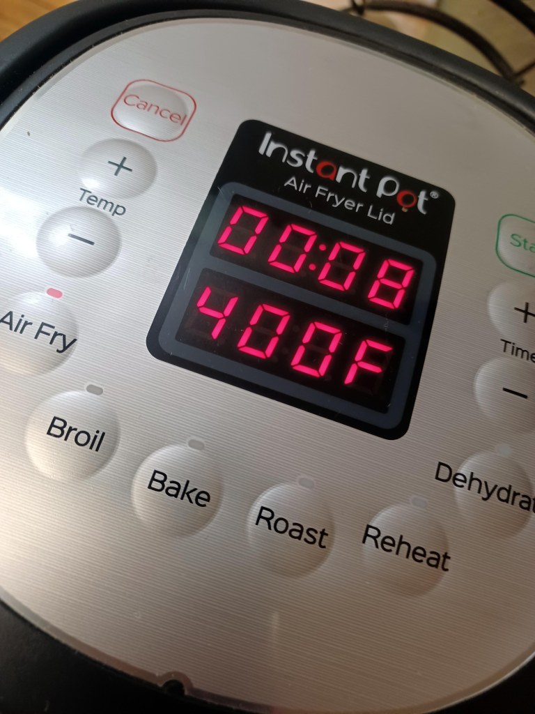 3. Pre-heat air fryer to 400 degrees. Set the timer for 7-8 minutes. I did 8 minutes, as pictured.