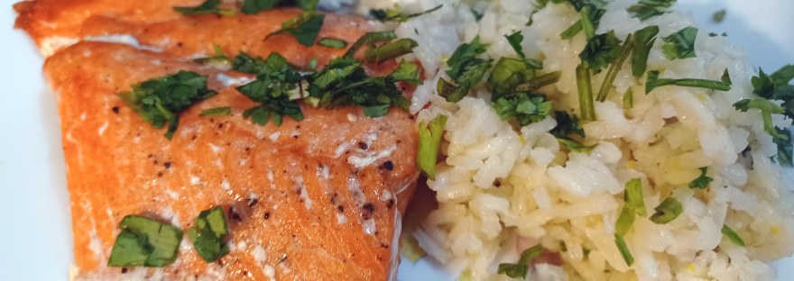 Squirt lemon over the fillets and serve with desired side dish. I served mine with some cucumber sauce and cilantro lemon rice that I made. They all complemented each other. It was very tasty not to mention healthy. If you’ve got a fryer, I hope you try this quick and easy salmon. Thank you for stopping by. It is greatly appreciated and Buen Provecho!
