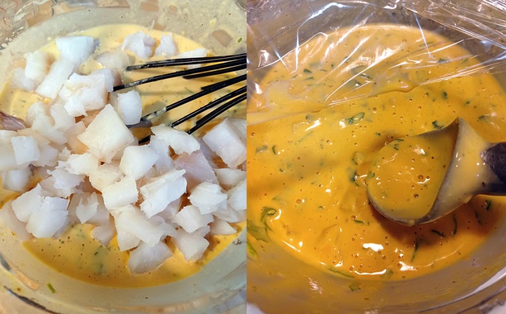 1. Defrost the cod and cut up into small 1/4-1/2 chunks. you can also shred them.