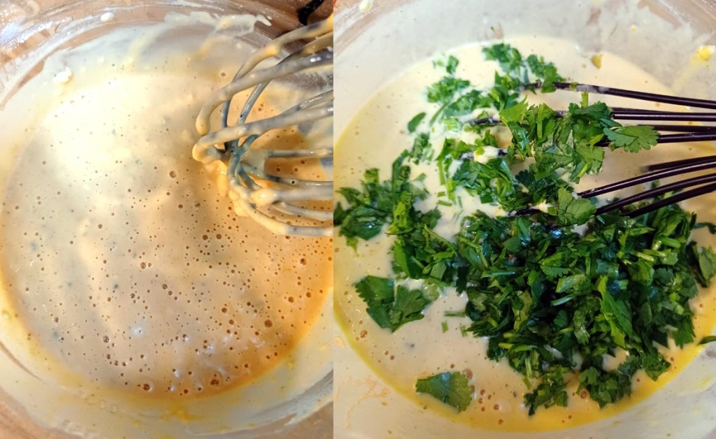 3. Mix all dry ingredients in a bowl with a whisk (see image above). Add at least 1 cup water and blend with whisk until the mixture is smooth and slightly runny. If you want them thicker add less water. Test for salt and pepper and add to taste. Add the fresh chopped cilantro at the end.