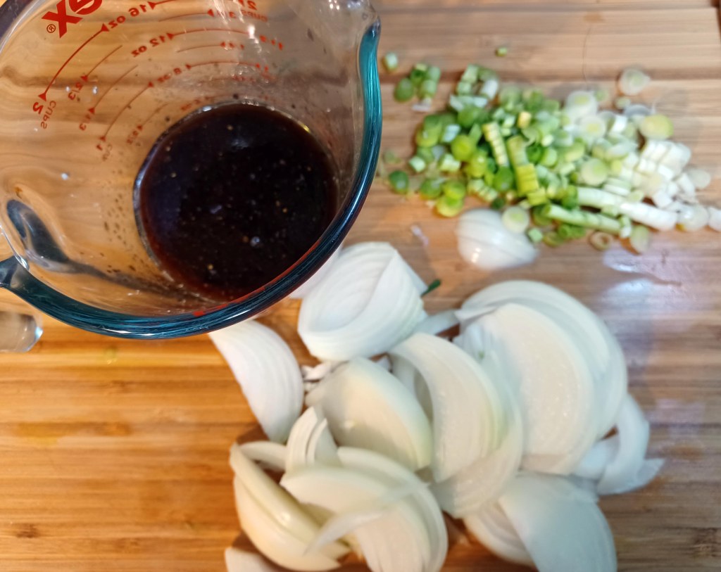1. First cut 2 green onions cut into small pieces. Chop the remaining green onions into 3-4 inch pieces. Cut white onion into strips. Set aside. Prepare the sauce by adding the soy sauce, sugar, mirin, a pinch of freshly ground black pepper and oyster sauce. Mix thoroughly until sugar is dissolved.