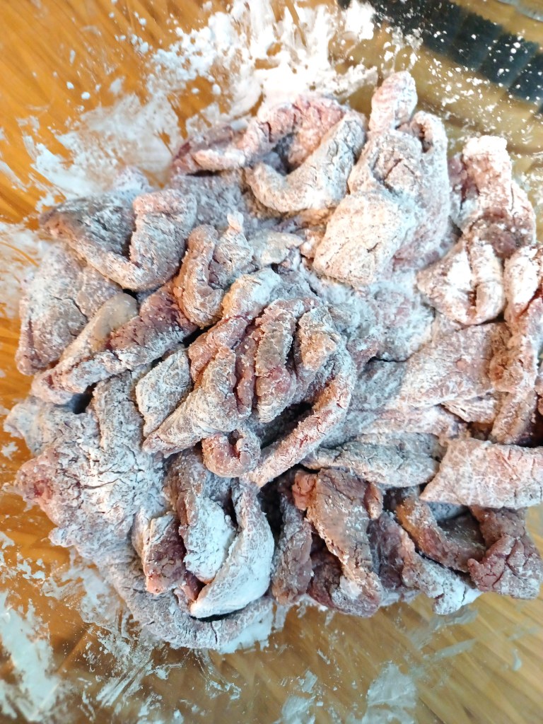 2. Next, finely slice meat and toss with a pinch of black pepper and the cornstarch until completely coated.