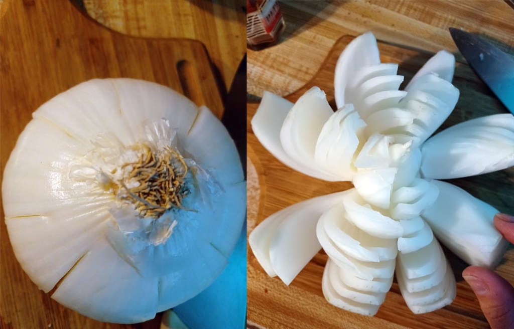 3. Cut a small flat spot on the top end of the onion. Remove the outer skin layer. Place the onion root side up on a cutting board. With a sharp knife, start about 1/2 inch from the root make a clean slice downward. Turn another quarter turn and make another clean slice downward. Repeat two more times. You should have four sections. Now cut three to four equal spaced cuts downward in each of those four sections. You should have 16 equal slices. Gently turn over the onion and gently fan out the sections. Usually, a yellow onion works best but I had a white one and it was still pretty good.